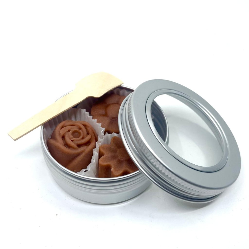 Zahřejte pralinku v dlaních, dokud nezačne tát. Máslovou směs rozetřete po pokožce. Neoplachujte. Ideální po sprše, koupeli nebo kdykoliv během dne.